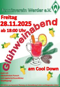 Zu Beginn der Adventszeit hat der TV Werder seine Mitglieder zum gemütlichen Glühweinabend einladen. Bei Glühwein und Punsch, zwei Suppen und so manchen Leckereien aus der Weihnachtsbäckerei sind viele Mitglieder ins Cool Down gekommen. An den hübsch geschmückten Tischen gab es viele Gespräche, die sich bis in den Abend hingezogen haben.